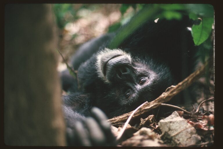 We hadn’t seen any chimps, we hadn’t heard any calls, it was completely silent in the forest. The monkeys had already left and sure enough, these three big males with their hair all erect in their search — the boundary behavior — came right in and encircled us and we just sat there and stared at our samples. We could hear them breathing. We didn’t look at them and you just knew they were investigating — they were making sure they knew what was going on and it wasn’t something dangerous. And then they left. And it was this just incredible experience of being the animal observed by the chimps.”